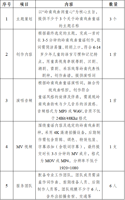 以“岭南戏曲润童心”为核心主旨,立足6-14岁少年儿童的认知特点与审美偏好,用童真视角串联粤剧、汉剧、潮剧、雷剧、采茶戏等岭南代表性剧种,打破传统戏曲与少儿群体的认知壁垒,引导广大少年儿童深入传承岭南戏曲艺术、弘扬中华优秀传统文化,厚植少年儿童家国情怀与文化自信,教育引领广大少年儿童听党话、跟党走,争当爱党爱国、勤奋好学、全面发展的新时代好少年。现拟将岭南戏曲童谣创作及MV视频拍摄制作相关服务内容进行委托,预算金额为人民币壹拾叁万元整(¥130000.00)。
