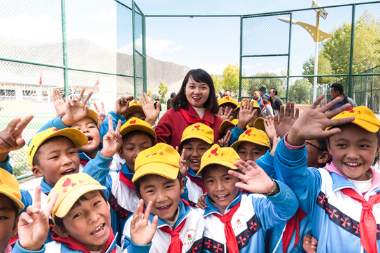 2019年10月21日,西藏自治区拉萨市曲水县达嘎乡其奴村,苏明娟和“大眼睛希望小学”的学生们合影。解海龙 摄
